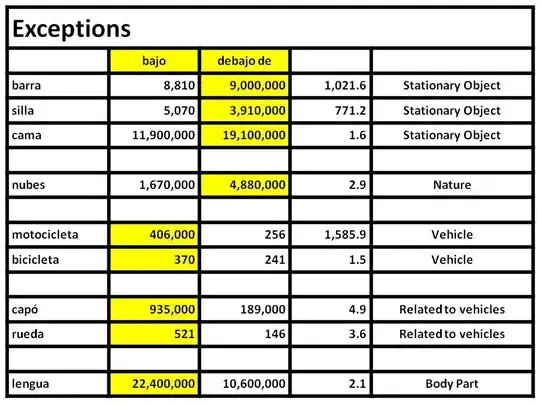 Columns of numbers show the number of web pages Google found for each pairing — bajo or debajo de. The highlighted cells indicate which pairing was more common. The third column of numbers shows how much more common the pairing was. These notes regarding columns apply to the next two charts in this posted answer. No filters were applied to the data for this chart other than language (Spanish). Data was originally collected December 28, 2018; a revision was made to correct data for "capó" December 31, 2018. Additional examples — control, presión, reflector, avión, acelerador — were also added December 31, 2018. To enlarge the image, simply click on it.