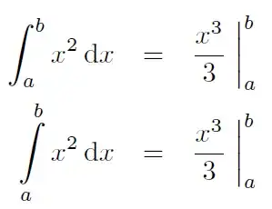 \[ \int_a^b x^2\;\mathrm{d}x= \tfrac{1}{3} x^3 \Big|_a^b \]