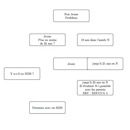 \node [block3, below right of =Jeune_Oui](25) {jusqu'à 25 ans en N \\ Si étudiant N-1, possible avec les parents \\ EEC : EOCCUA 4};