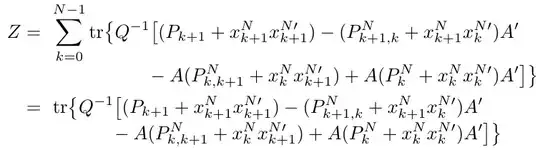 \sum_{k=0}^{N-1} \tr \bigl\{ Q^{-1} \bigl[ (P_{k+1} + x_{k+1}^N x_{k+1}^{N\prime}) - (P_{k+1,k}^N + x_{k+1}^N x_k^{N\prime}) A' \\