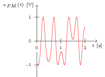 \draw [variable=\t, domain=0:2, samples=401, smooth, red] plot (\t, {cos(2*pi*10*\t + pi*cos(2*pi*1*\t r) r)}); % "r" v argumentu kosinu znamená, že argument je v radiánech