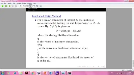 \item For a scalar parameter of interest $\theta$, the likelihood ratio statistic for testing the null hypothesis, $\text{H}_0$: $\theta$= $\theta_0$ versus $\text{H}_1$: $\theta$ $\neq$ $\theta_0$ is given as,