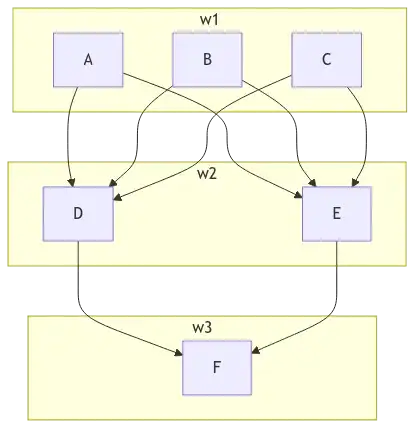 graphslibrary (for input syntax) would allow something like{A, B, C} -> [complete bipartite] {D, E} -> Ffor specifing the edges. Thegraphdrawinglibrary (need Lua!) with itslayeredlibrary would help in placing the nodes automatically. There's also sublayouts for the yellow boxes. – Qrrbrbirlbel Feb 14 '23 at 17:42graphslibrary as well. It doesn't do anything you can't do with nodes and edges already but the graphdrawing library kinda depends on it (and all the examples use it). – Qrrbrbirlbel Feb 14 '23 at 20:59\tikzMatrixNodeswith a few adjustments. – Qrrbrbirlbel Feb 14 '23 at 21:31
