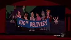 - The 100th-delivery party is a reference to the commemoration of the one-hundredth episode of Futurama.