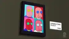 When Amy, Dr. Zoidberg, and Professor Farnsworth briefly teleported to the 1960s, [6ACV23] they were teleported in front of Warhol's work of art Campbell's Soup Cans. Warhol then walked up to them, referring to Zoidberg as a "marvelous lobster man", but soon dismissing him as a "horrid bore". The encounter resulted in the painting Unwelcome Guest in 1968, which contains four different-colored depictions of Zoidberg's head.