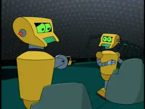 The barrier-bots guard the entrance to the Near Death Star. In 3001, they only let Fry in, thinking him to be Professor Farnsworth, when he provides them with a tissue sample (courtesy of Cubert), and impersonates an old man, and later, when Fry, Leela, Bender, and Cubert escape the Sunset Squad chasers, they break off the arm of one of the barrier-bots. [2ACV10]