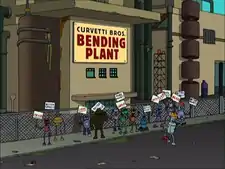 After being fired from Planet Express for having an uncontrolled bend-lust, Bender Bending RodrÃguez decided to take a job at the Curvetti Bros. Bending Plant, while a strike was going on at the plant. The robots were striking against the company for hiring scabs at ten times minimum wage and effectively putting all the striking robots out of a job.