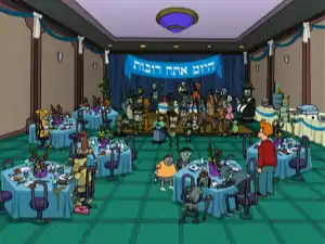 - At the Bot-Mitzvah, the banner reads "היום אתה רובוט" (hayom attah robot) with two misspellings, which translates to "today, you are a robot".