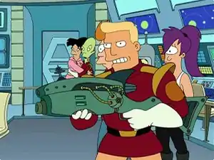 The handheld laser cannon is a weapon that was first used by Zapp Brannigan in 3003 on board the Nimbus to battle holograms which became real (4ACV01). Professor Farnsworth also used one to shoot Adolf Hitler in the second universe and Eleanor Roosevelt in the third universe during a time travel they began in 3010 (6ACV07).
