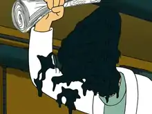 When Leela decided to get surgery to give her two eyes, Zoidberg suggested that she gets an ink pouch to help her escape her enemies. Farnsworth said that was a stupid idea, calling Zoidberg an imbecile, he prepared to hit Zoidberg with his rolled-up newspaper, but Zoidberg sprayed ink at his face and ran off, wooping. Zoidberg later sprayed ink on Leela while she was having dinner with Adlai Atkins (3ACV09).
