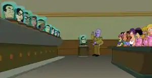 The Feministas are sentenced to Maxi-Padlock, a high security women's prison. And with the group gone, Leo schedules the demolition for the next day. Fry is unsure what to do, so he seeks out the Legion again. The Number 9 Man explains that Fry has to stop the Dark One from stopping him stopping Leo Wong, and in order to do that, he needs the Omega Device. The device, when activated, will momentarily disable the Dark One, giving Fry a chance to stop it. However, to recognize the Dark One, Fry has to come up with a plan himself, Hutch explains that its thoughts are unreadable, which gives Fry an idea.