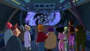 Zapp resumes his pursuit of Leela and the Feministas. As the crew approaches a worm hole, Leela finally admits to loving Fry. With little time, the crew agrees the only way to go now is in to the worm hole. Into The Wild Green Yonder.