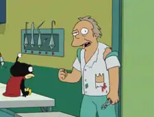 Vet Jeffrey Grant is a male Human who is a veterinarian at the pet clinic. He has had a lot of injuries including those caused by a gazelle kick and an attack from a jaguar. His tooth was knocked out, and he gave it to Nibbler, whose fang was broken. [2ACV01] Grant with his family was seen eating at Elzar's Fine Cuisine. [2ACV13] Grant and his family attacked Santa Bender when he entered their house. [3ACV03]