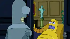 Fry questions Bender about the details of the crime, hoping to prevent him from committing it. Instead, Fry inadvertently informs Bender about the target of the crime; a priceless bottle of strong malt liquor stored in Hedonism Bot's wine cellar. Upon examining the vision in closer detail, Fry sees that he will fatally shoot Bender to prevent him from stealing the bottle. He decides that he will deliberately not shoot Bender, which causes a vision of an alternate future to be created, in which Bender escapes. The alternate vision shows that Bender will share the stolen liquor with the crew at Planet Express, poisoning and killing all of them.