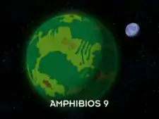 Description: Amphibios 9 is a hot and steamy swamp planet. It is inhabited by Amphibiosans, a species of which Kif is a member. Glab, the female president of DOOP, is also a native. The sky of Amphibios 9 is a dark yellow.