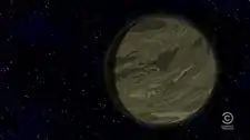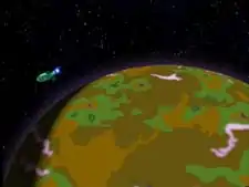 Description: Vergon 6 was a sunny little planet home to many species of non-sentient animals and for the past 1000 years, Nibbler. The planet was once full of dark matter, but it was all mined out by the DOOP, leaving Vergon 6 completely hollow. It is almost completely covered in plains with the occasional pond or rocky outcrop or other landform. Vergon 6 imploded because there was nothing to hold up the surface, but as Leela pointed out, some of the animals survived on the tiny bit of Vergon VI's core. The planet's sky was green-yellow with light green clouds. It had at least three moons.