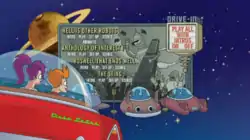 - The DVD menu shows Fry and Leela at a Drive-In Cinema in space. When clicking on 'Scene Selection' for each episode, the menu is the promotional image for the episode done in the styles of posters of Horror movies in the 50's with each scene selection saying SEE!, FEEL!, HEAR!, SMELL! and TOUCH!.