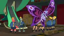 Mothzilla is a giant moth that, in 3012, got into the ship's closet during a delivery to Tokyo, [7ACV11] where it partially ate Fry, Bender, Leela, Zoidberg, and Amy's uniforms. After the crew returned to Planet Express, it did the same to the uniforms of the professor and Hermes.