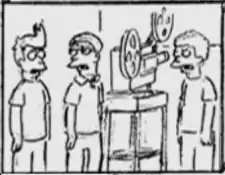 The nerdy teens were two members of the A.V. Club at Fry's presumed high school in the storyboard for "Space Pilot 3000". They are simply titled "nerdy teen" and "less nerdy teen" in the storyboard, with neither teen directly identified and with little else known about them. When Leela viewed Fry's life on the biographic projector, she sees Fry asking to join the A.V. Club. The nerdy teens rejected him, after having done so multiple times before, and then told him to stop going around telling others that he was in the club.