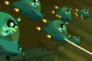Fiona: The brains are weakening. [She presses an intercom button.] Nibblonians to Nibble stations. Prepare cuddle bug for deployment in 40 nibblets.