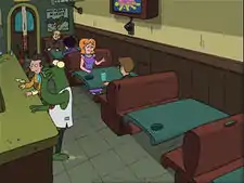 • In "Space Pilot 3000", in the year 1999, Fry bicycles past an identical pub called "O'Grady's". As street level is now much higher than where O'Grady's was, it is not the same building. Instead this is a reference to the fact that while many things have changed others have stayed the same.