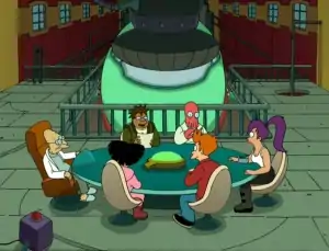 The situation room is in fact the bathroom in which the professor can be seen taking many baths (many times calling in the crew, the room has a bath, tiles, a sink, and a floating bath toy modelled after the Planet Express Ship).