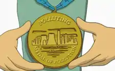 The Polluting Medal of Pollution is a medal received by Professor Farnsworth as a reward from Richard Nixon's head when the Professor fixed the Global warming problem by moving the Earth further from the sun using the robots' exhaust. It produces pollution, the image of factory towers blows real smoke. It is Earth's highest honor.
