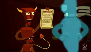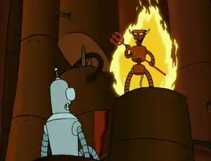 After Bender was killed by Lynn and became a ghost, the Robot Devil made yet another deal with Bender saying that if Bender killed Fry then he would be restored to his old body (in retaliation for Fry taking his hands) (6ACV19). But Bender eventually decided that he couldn't kill Fry and would rather spend eternity in Hell. Bender took over and managed to destroy the Robot Devil's body, and after their ghosts returned to Earth the Robot Devil took over one of his replacement bodies. But he did not get to keep Bender since Bender was saved by Robot God.