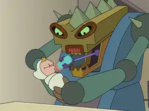 At Roboticon 3003, Robot 1-X was introduced by MomCorp. This new model is designed not to run on alcohol and exhaust pollution, but rather to run on pollution and exhaust fresh smelling oxygen. Extremely intelligent and obedient, as well as hovering instead of walking, it is mostly considered a laborer robot.