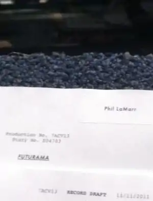 On 27 January, she revealed that the first full-color animation for "7ACV01" had been screened on the FOX lot, that it received "lots of yays",[71] that she could not go due to her work on "7ACV14", that she watched it nonetheless and that she found it "lovely".[72] On 14 February, she revealed that the animatic for "7ACV14" was "done" and would be screened "[on the next day] at the FOX lot".[73] On the next day, she revealed that she thought that it had gone "pretty well".[74] On 9 March, she revealed that she had "Just read [her] next and last [Futurama] script for a while", the script for "7ACV20", that it was "really funny [and] cute" and that she was "Looking [forward to working] on it after [the production team finished "7ACV14"]".[75]