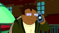 ![]() Hermes using Shazam, in the Planet Express conference room, in 3013. [7ACV23] Behind him is the Planet Express ship. | |||||||