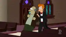 In 3013, Fry and Leela got married in the cathedral. [7ACV26] Because Fry had accidentally frozen the universe, the people that were at the wedding were paralysed and had to be carried in. Fry and Leela brought the Space Pope, but they were their own marriage officiant.