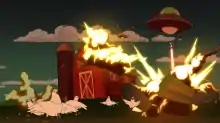 - [Scene: A farm. Suddenly, it is attacked by UFOs shooting at everything in sight. Military forces are there, firing at the UFOs.]