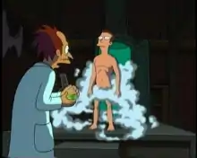 - [A pod reminiscent of the ones from the movie "The Fly" opens with a cloud of steam. It clears, revealing a naked human male.]