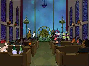 - (Aside from Primary characters) Leo and Inez Wong, Michelle, Petunia, Sal and Scruffy appear at the funeral. Many of the women that Fry had previously been romantically linked with attend the funeral and sit in a group together, including the Radiator, but excluding Umbriel, who obviously can't breathe out of water. Scruffy also plays 'Walking on Sunshine' on the bagpipes at Fry's funeral.