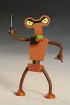 In 2007[1] the Toynami toy line received the rights to produce Futurama action figures. There have been other lines with this license, but none lasted long. However, this is the longest consistent action figure line, with 9 series so far released, and at least 10 series currently planned. The figures are an average of 6 inches or 15 centimetres tall. As of 23 April, 2013, the main line of figures and the talking Robot Devil are officially cancelled, with the Tineez and plush lines to continue. A Kickstarter campaign was announced by Toynami at San Diego Comic Con 2013 for the main series Mobro but never materialised. Toynami has announced that 2014 is the final year of their Futurama licence.
