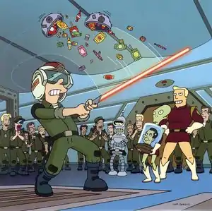 Zapp Brannigan: As you all know, the key to victory is the element of surprise. Surprise! [Pushes button, the soldiers fall onto the surface of Spheron 1.]