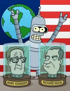 It turns out that the enemy are enormous crowds of living balls who attack the Earthican troops by bouncing up and down on them. The soldiers defend themselves and inflict casualties with the enemy, Fry excels by an act of cowardice through which they are overrun. As a bomb is rolling into the Earthican lines, Bender throws himself onto the bomb so it detonates harmlessly inside his chest cabinet. The wounded are brought to a field hospital that has an air of M*A*S*H around it, Zoidberg is part of the surgical team and having his differences with iHawk. Zapp Brannigan makes Fry Kif's assistant for his cowardice. Meanwhile Bender is not too well, but Richard Nixon's head orders him fixed as he has some plans with him. Once Bender is whole again, he is sent on a mission of peace to the enemy leaders, the Brain Balls, and with him goes Earth's top peace negotiator, Henry Kissinger's Head. However, in the shower Fry and Lee Lemon overhear Zapp and Nixon planning to blow up the whole planet with a bomb hidden inside Bender, which is activated by Zapp with a remote control as Bender and Kissinger are already negotiating with the Brain Balls.