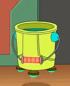 The wash bucket is a simple Robotic mop bucket that is used by Scruffy as janitorial equipment, and who secretly holds passionate love for Scruffy. Her primary function is to hold mop water. She had her mind switched with Bender while he was in Amy's body, and then Bender swapped minds with the Robo-Hungarian Emperor Nikolai. The Emperor then pretended to be Bender while in the wash bucket's body. While in Amy's body, she confessed her love to Scruffy. Although Scruffy too had feelings, he felt it was wrong and sent her away, presumably forever. Although she is later seen in "Law and Oracle" assisting Scruffy when it is revealed he is a zombie, although this is only a cameo appearance with no speaking role.