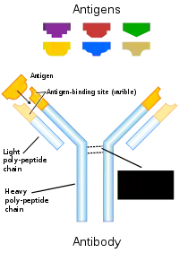 Antibodies (also known as immunoglobulins) are globular glycoproteins that are found in blood and are used by the immune system to identify and neutralize foreign objects, such as bacteria and viruses. An antibody always consists of four polypeptide chains, two heavy, two light - disulphide bonds hold these chains together. Each molecule has two identical antigen binding sites, formed by two types of chains, and the sequences of amino acids in these regions are known as the variables, since they determine the antigen specificity.
