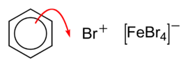 Once a suitably electrophilic species, E+, has been generated, it will react rapidly with benzene. A highly unstable intermediate (containing a tetrahedral carbon) is formed, which significantly disrupts the delocalisation of electrons in the ring. The intermediate immediately releases a proton in order to regain a fully aromatic ring and hence decrease its energy considerably.