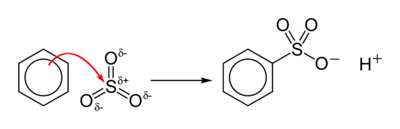 Concentrated sulfuric acid contains some sulfur trioxide, SO3, which is thought to be the electrophile involved in the sulfonation of arenes. SO3 has a large positive partial charge on its central sulfur atom, which is electrophilic enough to attract delocalised electrons from a benzene ring.