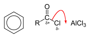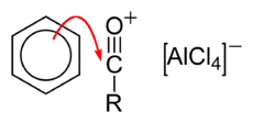 The electrophile at the centre of Friedel-Crafts acylation is the acylium ion, [RCO]+. Its carbon atom carries a large partial positive charge and is highly electrophilic, allowing it to react with very unreactive arenes such as benzene. Bonding in the acylium ion is best described as a resonance hybrid of two canonical forms: