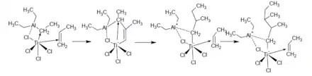 The following description is a summary of events for the polymerization of propene to isotactic polypropylene using triethylaluminum and titanium tetrachloride. Electron deficient titanium tetrachloride immediately coordinates a secondary carbon of triethylaluminum as well as the carbon carbon double bond of propylene. After coordination of one of the chlorine atoms with aluminum, the covalent bond between aluminum and the secondary carbon is weakened. From there, this secondary carbon becomes strongly coordinated to the titanium atom. Polymerization is initiated through destabilization of the carbon carbon double bond resulting in C1 of propylene being coordinated by the aluminum in place of the original ethyl group. From there, a new propylene molecule is coordinated by the Titanium, destabilizing the carbon carbon double bond until the C1 atom becomes coordinated with the aluminum, continuing the polymerization.