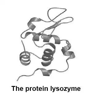 Long chains of amino acids often link with other amino acid chains and the resulting protein molecule may twist, spiral and fold up to make a complex 3-dimensional shape. As an example, see the diagram of the protein lysozyme below. Believe it or not, this is a small and relatively simple protein.