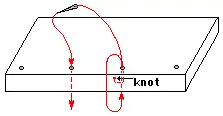 To finish, tie off the thread so the binding won't come loose. Do this by slipping the needle under two of the top threads coming out of starting hole and back through the loop to form a tight knot.