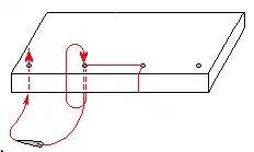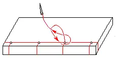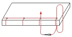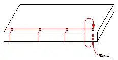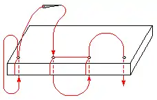 ...around the bottom of the spine and back through the bottom hole. Go up through the starting hole again.