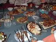 Known as the destarkhan or sofrah, the table spread is an important expression of culture in Afghanistan. Regardless of economic status, creating an adequate destarkhan is important to any family, especially when having guests. A large cloth will most likely be spread over a traditional rug in the living area or on a formal dining table. Most likely a young member of the family will present a "aftabah wa lagan", a copper basin and elaborate pot filled with water for the household to wash their hands in. He or she will go around the destarkhan to each member, pour water over the hands. Soap is provided, as is a drying cloth. The destarkhan is then dutifully filled with breads, accompaniments, relishes, appetizers, main courses, salads, rice, and fruits. Arrangement of foods is important when having guests; they must have easy access to the specialty foods. Young children are taught how to spread a good destarkhan and will be busy helping their parents.
