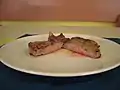 My recipe, however, uses a red-wine onion gravy and is adapted from a recipe that was published in a cooking magazine[1] . The magazine's recipe uses a lot of butter during the cooking process, which raises the calorie intake per serving considerably. This recipe is a reduced-calorie version of the original, but nevertheless a flavorful one. The butter, if not left out entirely, can be replaced by healthier vegetable oil. There are no measurements in the recipe telling you how much oil should be used, but in practice, the least possible amount has worked out well without sacrificing the taste. This way, the meal can be enjoyed without having to worry about rising cholesterol levels. The meat juices mentioned above are also used in the cooking process and so their intense flavor will not go to waste.