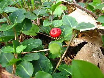 Partridgeberry, Partridge-berry, Two-eyed berry, Twinberry, Squaw vine Pain-de-perdrix |